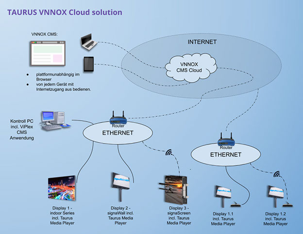 Dieses Beispiel zeigt wie einfach der Anschluss eines VI-Signs ist. Im Grunde wird das Sign einfach per LAN oder WLAN (optional) in ein bestehendes Netzwerk eingebunden.